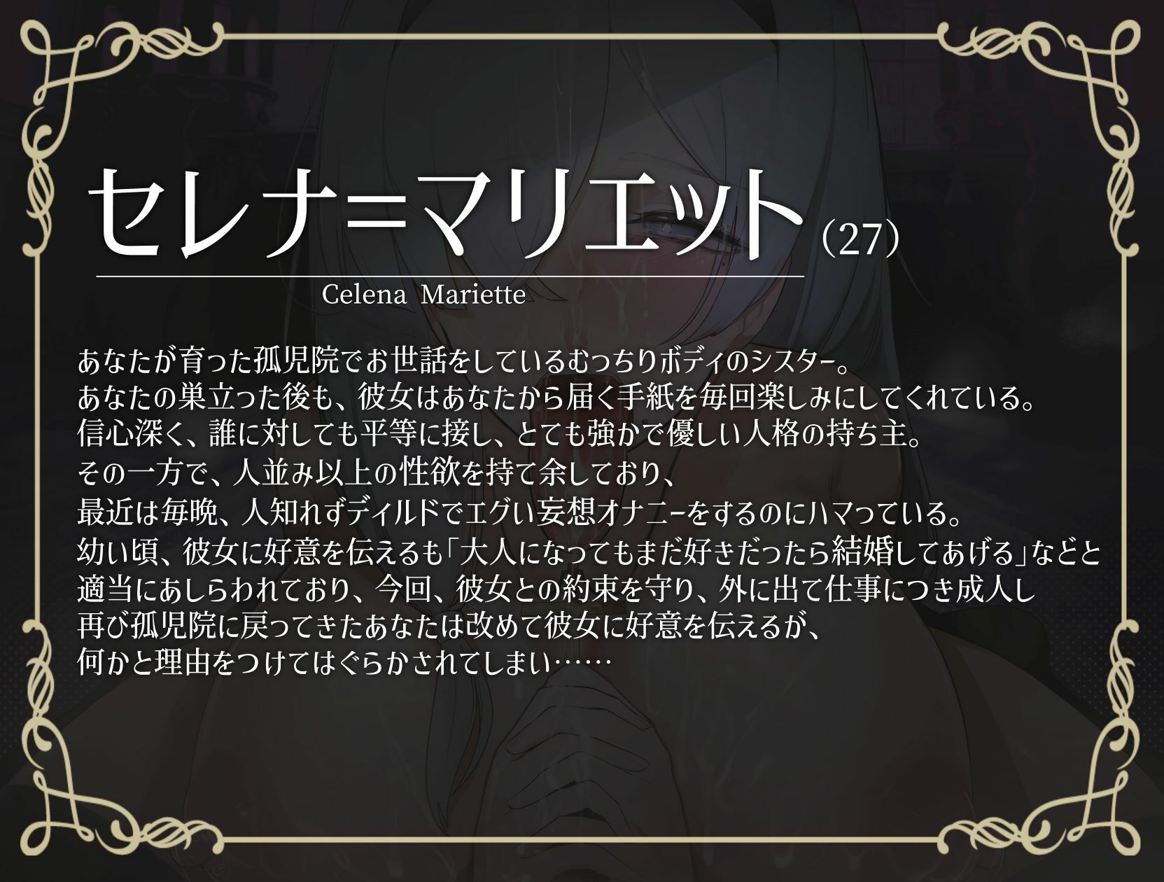 あなたが育った孤児院でお世話をしているシスター。 信心深く、誰に対しても平等で優しい 一方で、人並み以上の性欲を持て余しており、 最近は毎晩、人知れずディルドで妄想オナニーをするのにハマっている。 幼い頃、彼女に好意を伝えるも「大人になってもまだ好きだったら結婚してあげる」などとあしらわれており、今回、再び孤児院に戻ってきたあなたは改めて彼女に好意を伝えるが……