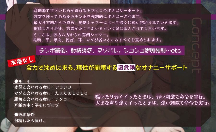 意地悪でマゾいじめが得意なヤマビコのオナニサーポート。言霊を使ってあなたのチンポを強●的にオナニーさせます。最大8方向からの責め、罵倒シャワーによって徐々に追い詰められていきます。