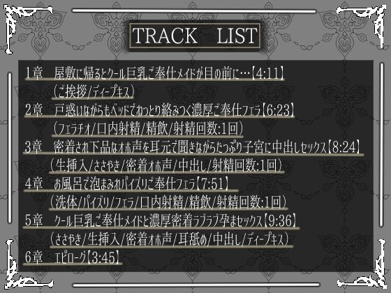 ジャンル: メイド、巨乳、中出し、フェラ、ごっくん、男性向け、成人向け、ささやき、口内射精、オホ声、ご奉仕、ダウナー