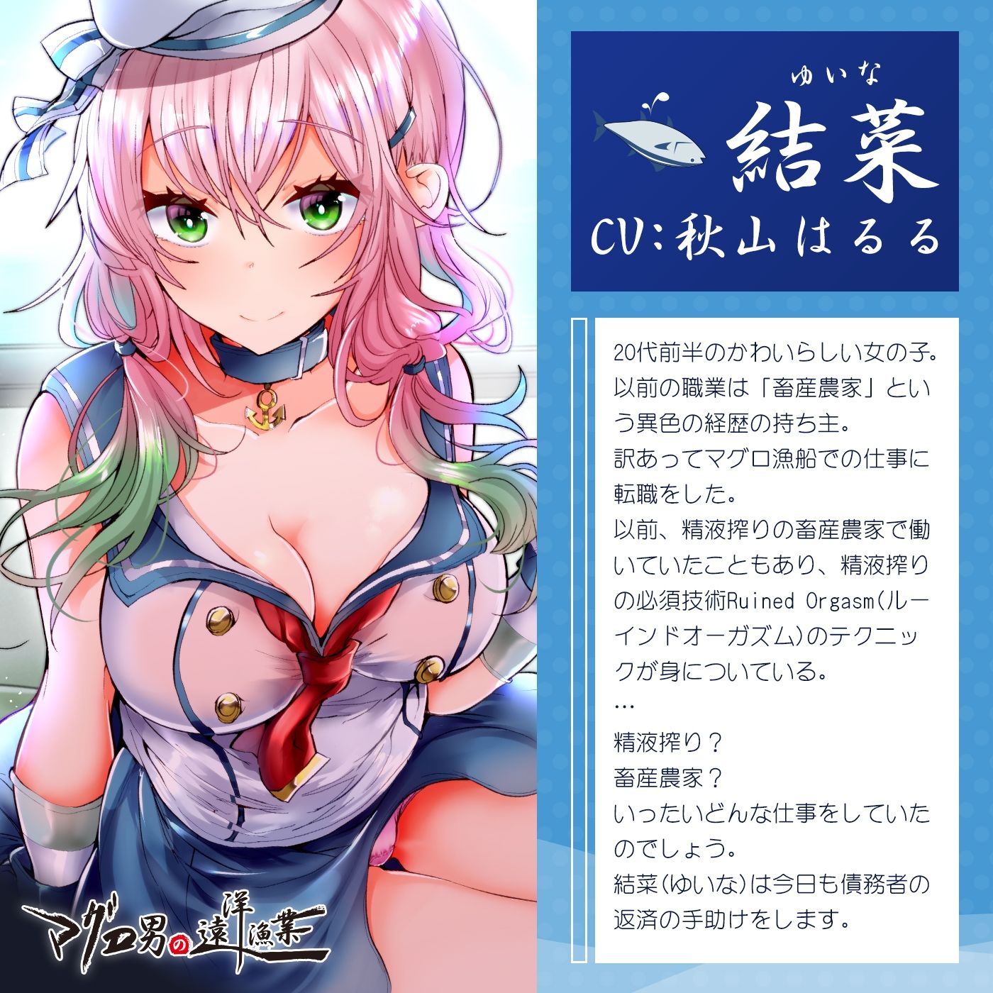 ギャンブルに手を出した事がきっかけで多額の借金の返済ができなくなったあなた。あなたは取り立ての怖いお兄さんに「マグロ漁船で働いてもらうからな?」と連れていかれ、マグロ漁船に乗船して強●労働することに。これから借金の分だけマグロ漁船で働くことになりました。返済分を稼ぐまでは陸に戻ることは許されず、海の上での生活となってしまいます。でもやるしかありません。覚悟を決めて、いざ、遠洋マグロ漁業へ!…え?そのマグロじゃない?マグロを釣るわけではなく、マグロ男になれ?どういうこと?しかも海の男との仕事ではなく、かわいいお姉さん──。