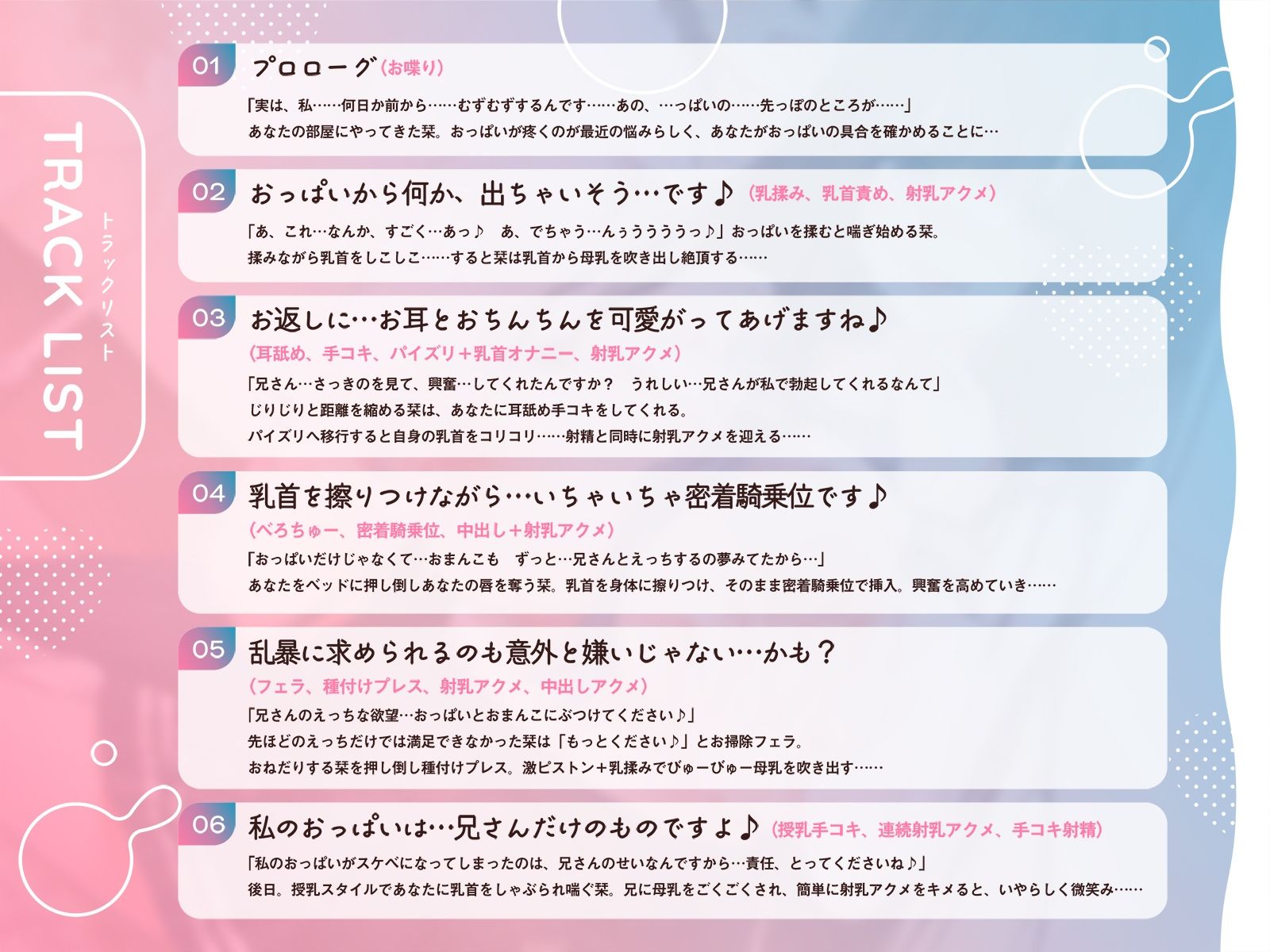 ジャンル: 巨乳、ラブラブ・あまあま、実妹、搾乳、男性向け、成人向け、バイノーラル、セーラー服、オホ声、KU100、アクメ、授乳