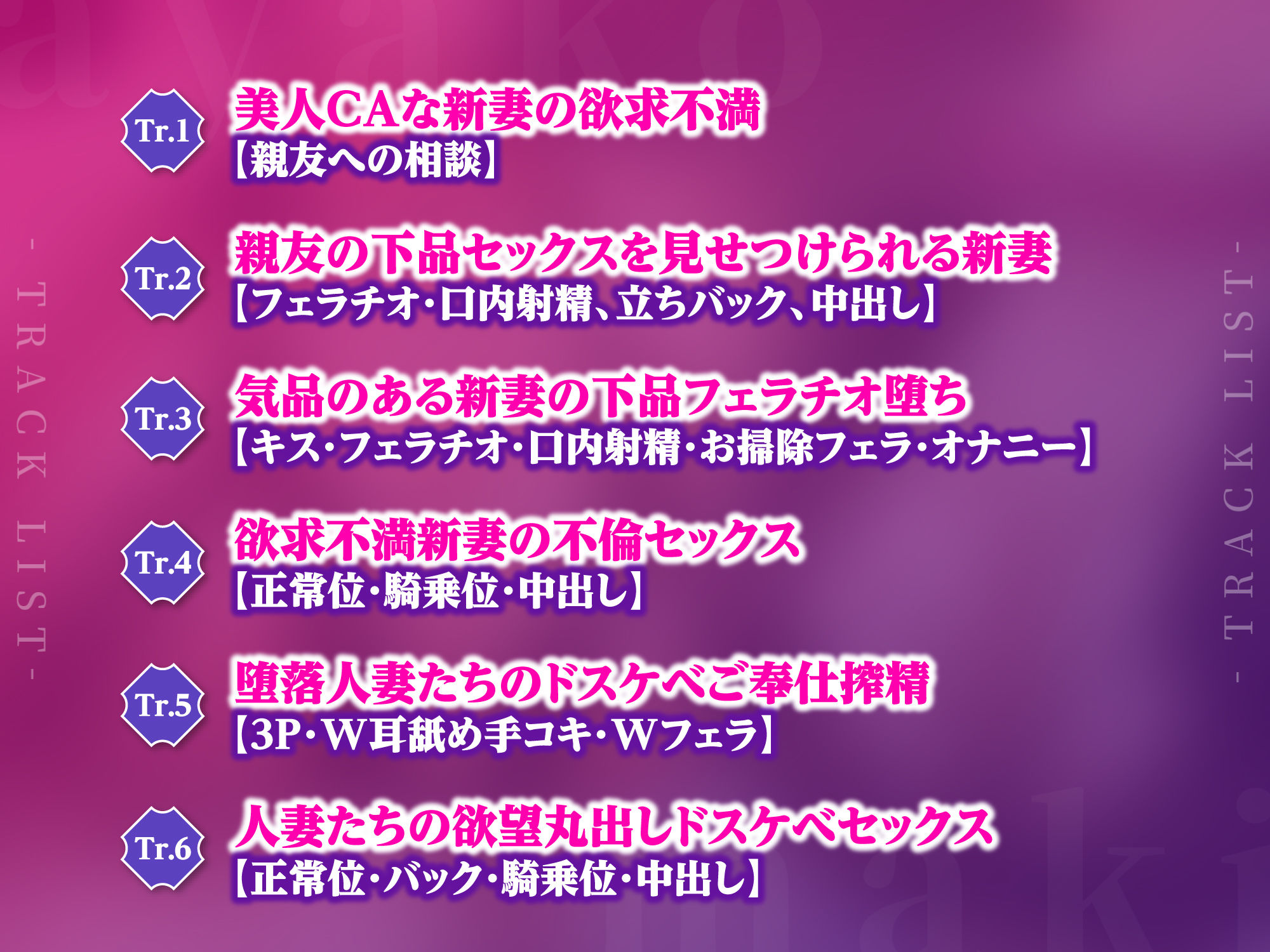 ジャンル: 人妻・主婦、寝取り・寝取られ・NTR、中出し、3P・4P、退廃・背徳・インモラル、おっぱい、男性向け、成人向け、ASMR、バイノーラル、淫乱、メス堕ち