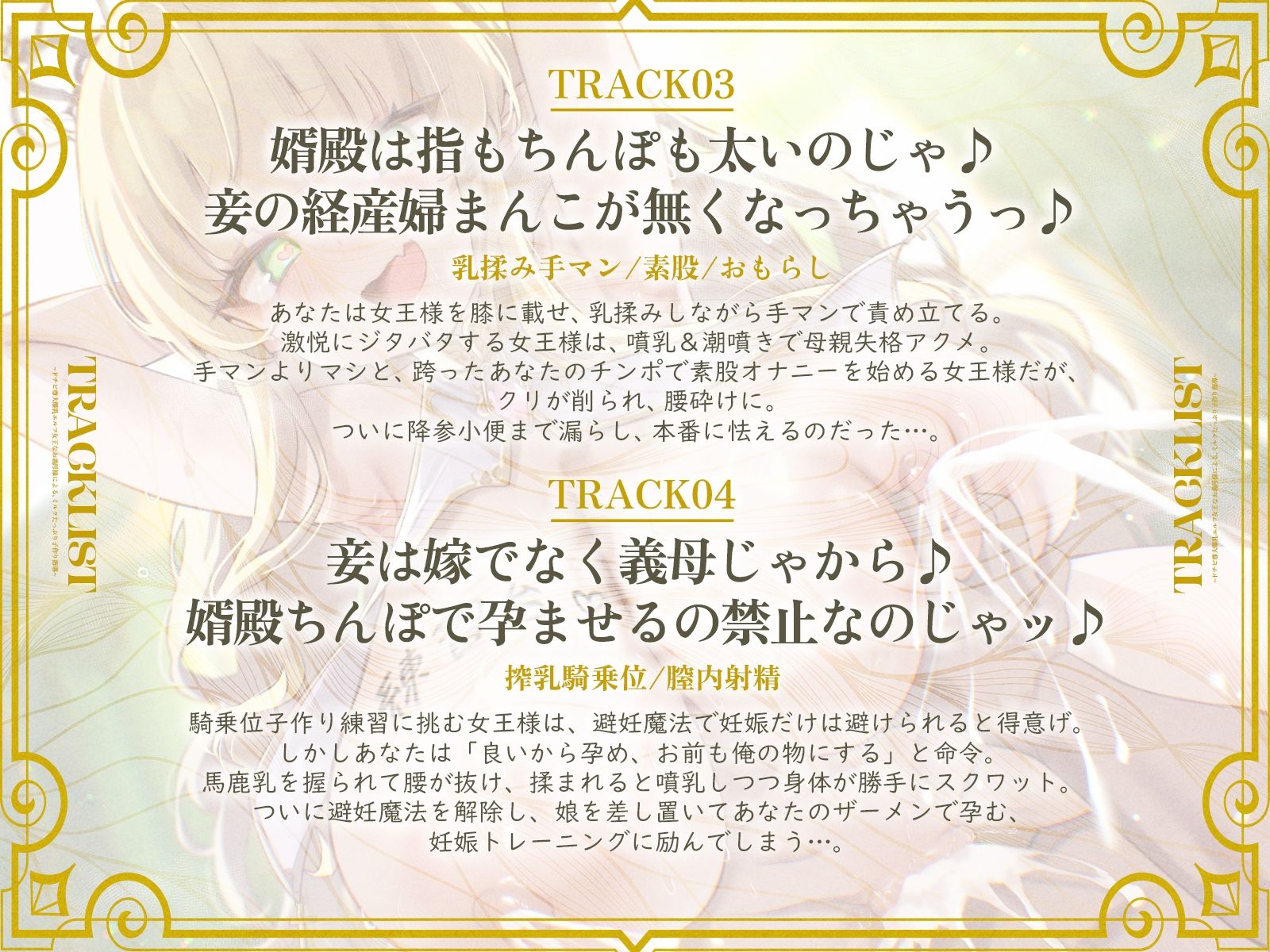 ドチビ尊大爆乳エルフ女王なお義母様による、ミルクたっぷり子作り指導♪娘の前に、妾で練習しまくるのじゃ♪(KU100マイク収録作品) あらすじ